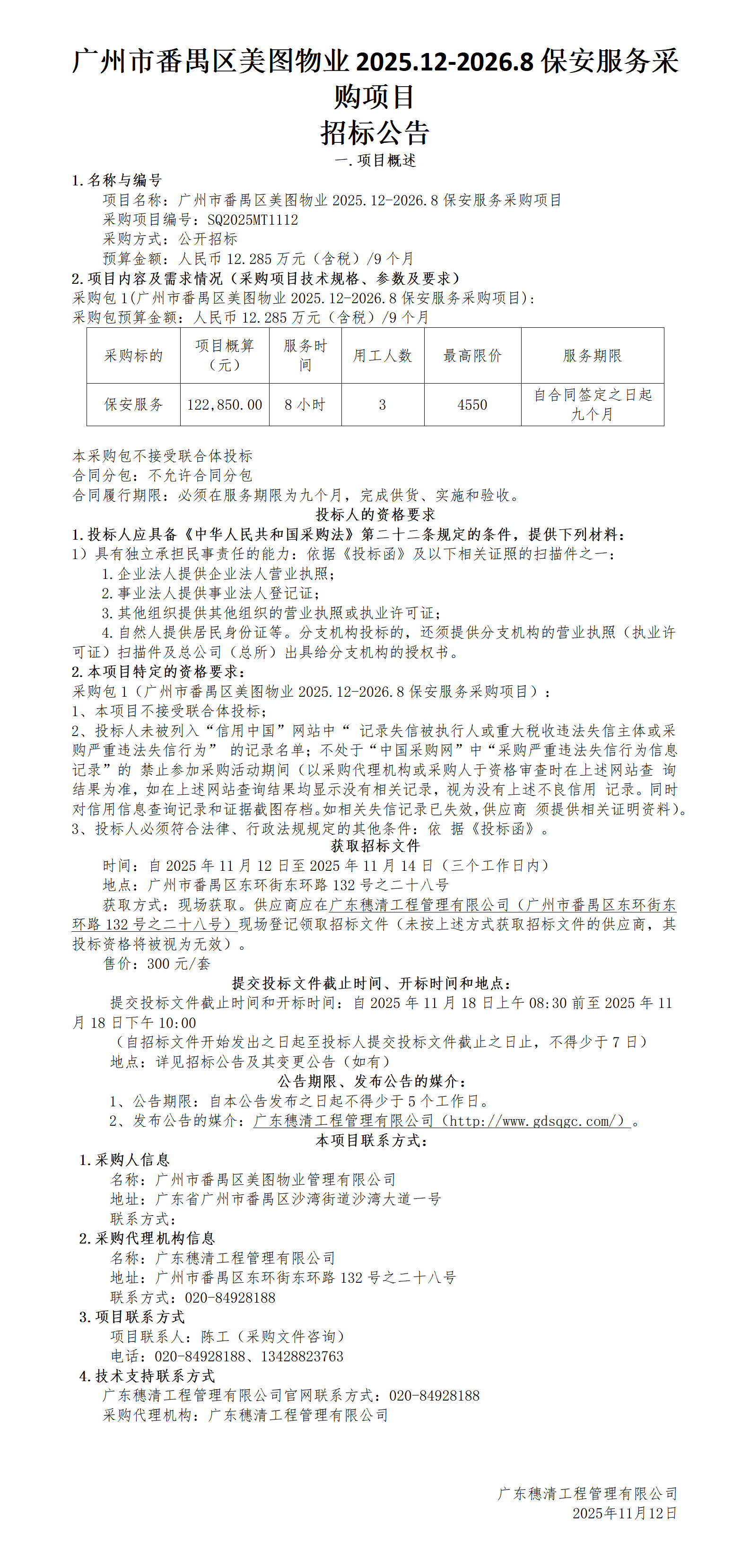 广州市番禺区美图物业2025.12-2026.8保安服务采购项目