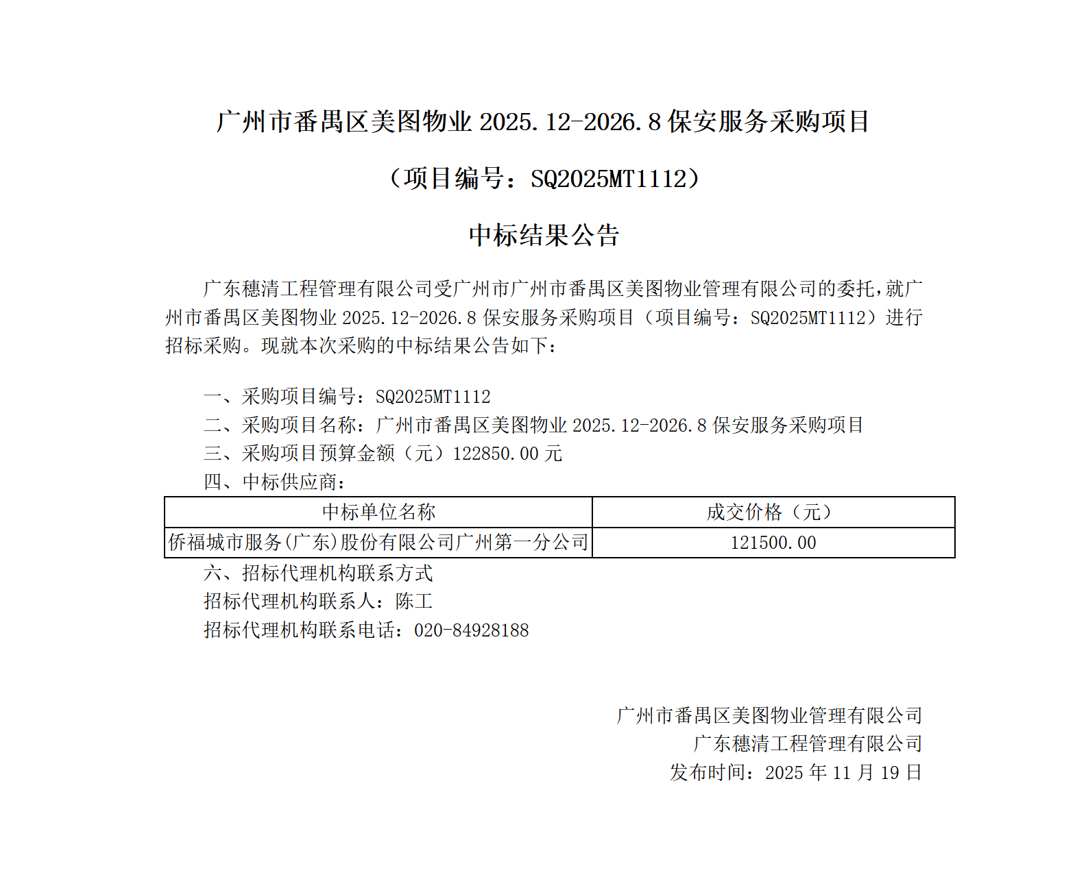 广州市番禺区美图物业2025.12-2026.8保安服务采购项目